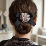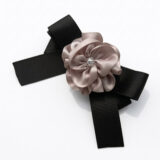 Sophisticated black grosgrain ribbon in an asymmetric drape, centered with a full-bloomed dusty-rose satin flower and a crystal-drop jewel. Chic, editorial, and effortlessly grown-up.