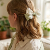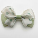 A neat double-layer bow in ivory satin printed with sage green polka dots, finished with a sage satin center wrap. Fresh, clean, and effortlessly classic.